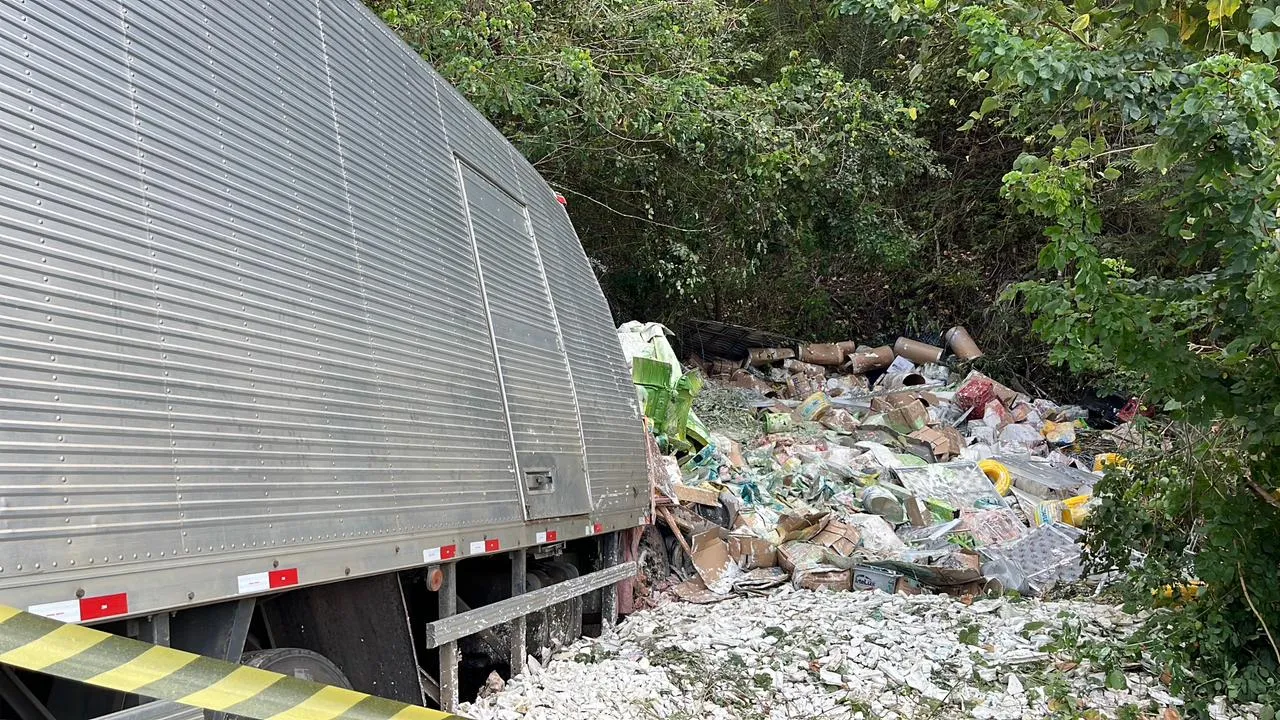 Um caminhão-baú que transportava material de construção tombou na manhã desta quarta-feira, 22 de outubro de 2025, na rodovia estadual PB-077, em um trecho conhecido como Serra do Espinho, entre os municípios de Pilões e Cuitegi, no Brejo da Paraíba.