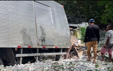 Um caminhão-baú carregado com material de construção tombou na manhã desta quarta-feira (22) na rodovia estadual PB-077, trecho que liga os municípios de Pilões e Cuitegi, no Brejo da Paraíba.