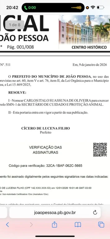 Com fundamento nos artigos 60 e 76 da Lei Orgânica de João Pessoa, a portaria que consolida a indicação traz todas as disposições legais que respaldam o preenchimento da vaga na estrutura administrativa da Prefeitura. O documento foi assinado digitalmente pelo chefe do Executivo municipal e pode ser consultado no site oficial por meio do código de verificação 32CA-1BAF-062C-5665.