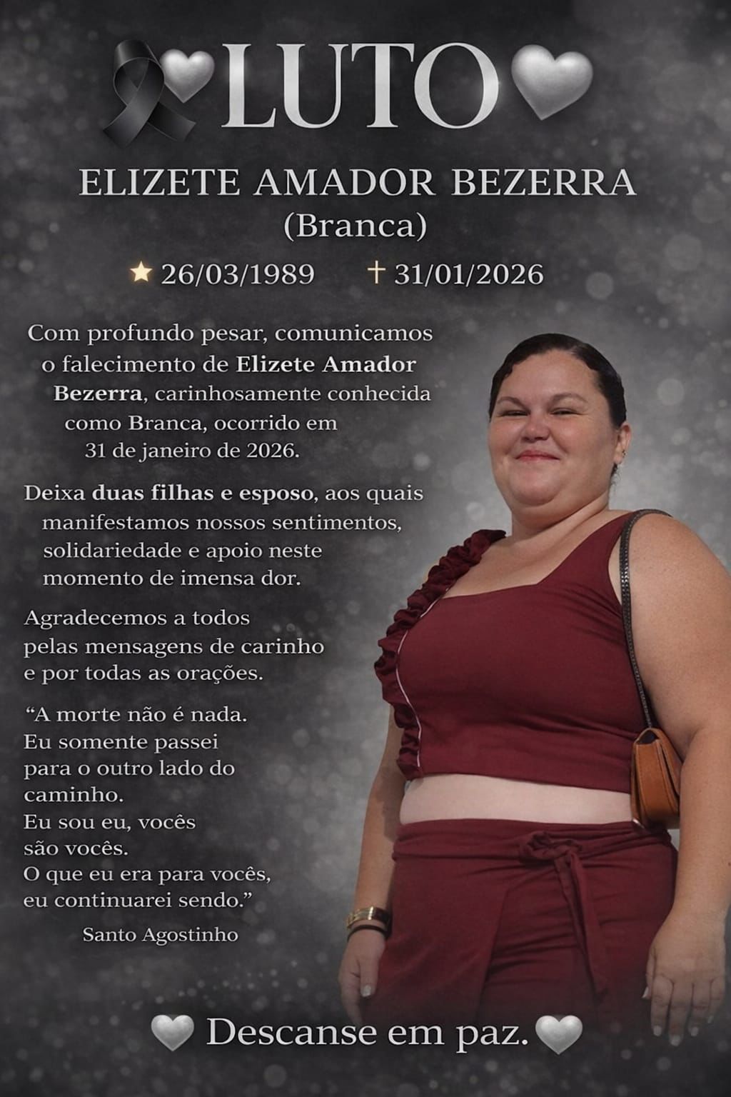 A dona de casa Elizete Amador Bezerra, conhecida como Branca, faleceu no sábado, 31 de janeiro, aos 37 anos, em um hospital de Patos, no Sertão da Paraíba. Ela havia viajado à cidade para dar início ao tratamento de saúde após receber o diagnóstico de câncer de mama.
