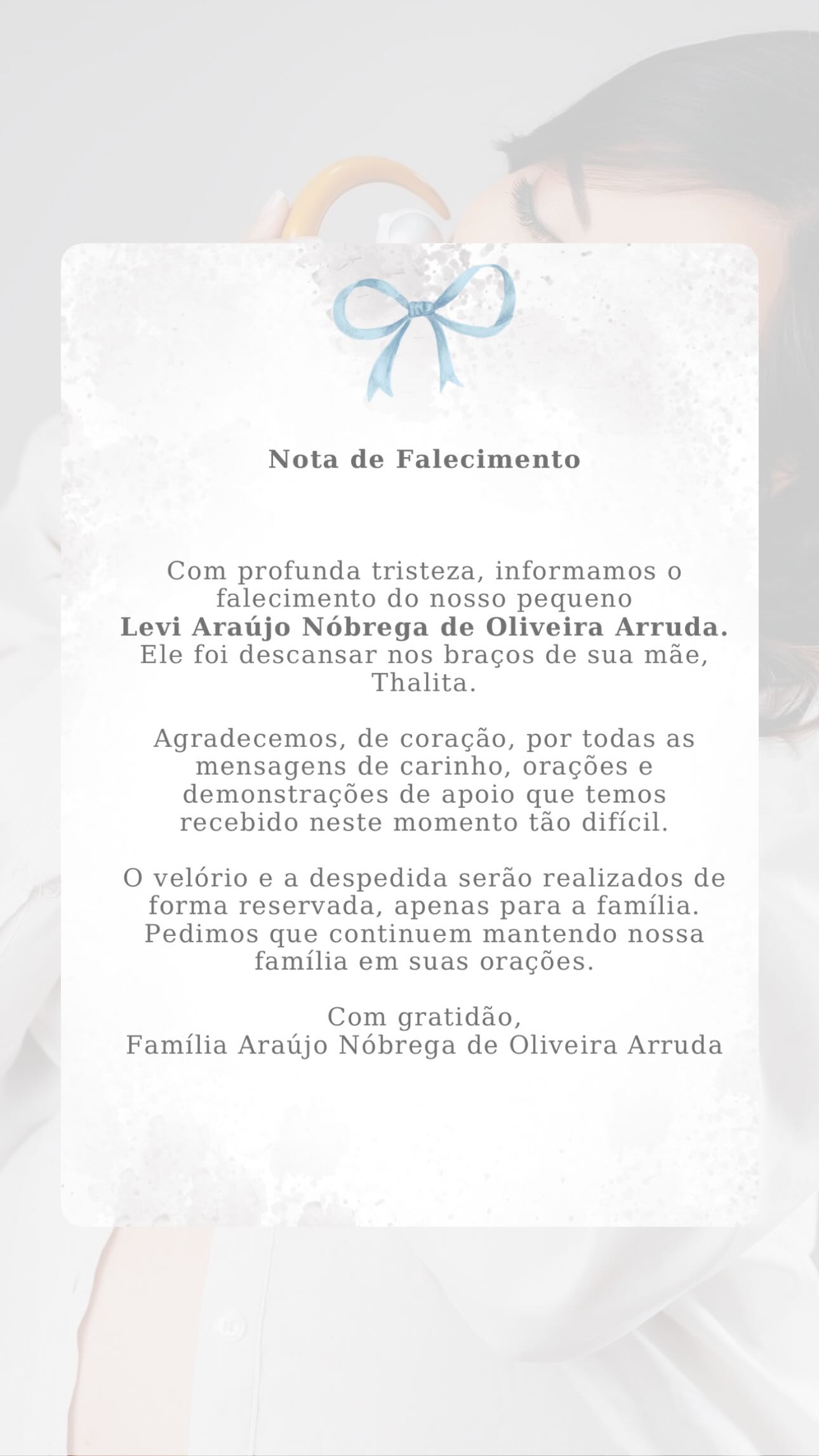 O bebê Levi, filho da bailarina e empresária campinense Thalita Nóbrega, morreu na noite desta segunda-feira (27) na Unidade de Terapia Intensiva (UTI) neonatal onde recebia cuidados desde o parto. A informação foi divulgada em nota oficial pela família Araújo Nóbrega de Oliveira Arruda.