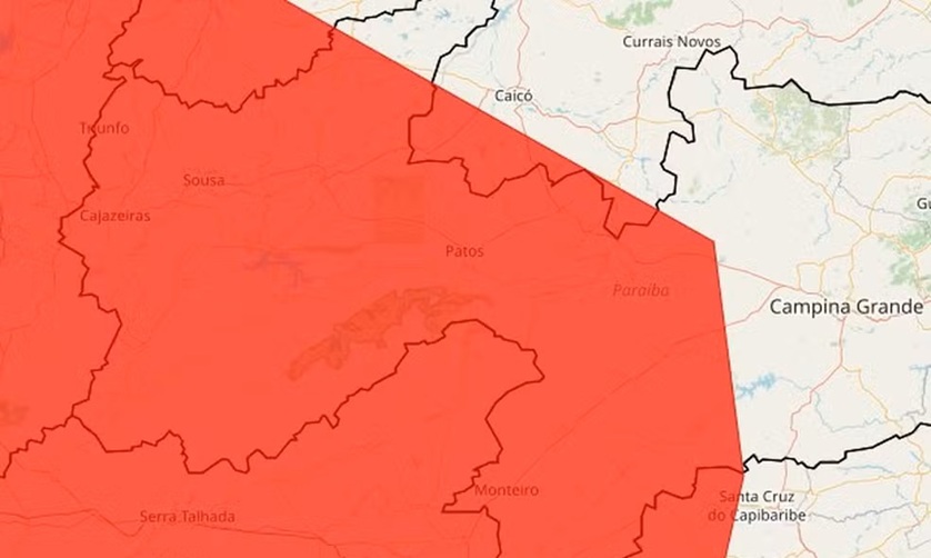 O Instituto Nacional de Meteorologia (Inmet) divulgou, neste sábado (28), um alerta vermelho por risco de chuvas intensas para 116 municípios da Paraíba. Segundo o órgão, o aviso de grande perigo para acumulados de chuva vale até o fim do domingo (1º). Paralelamente, foram publicados alertas laranja e amarelo que abrangem, respectivamente, 159 e 63 cidades, com validade até as 23h59 (Brasília UTC-3) deste sábado (288).