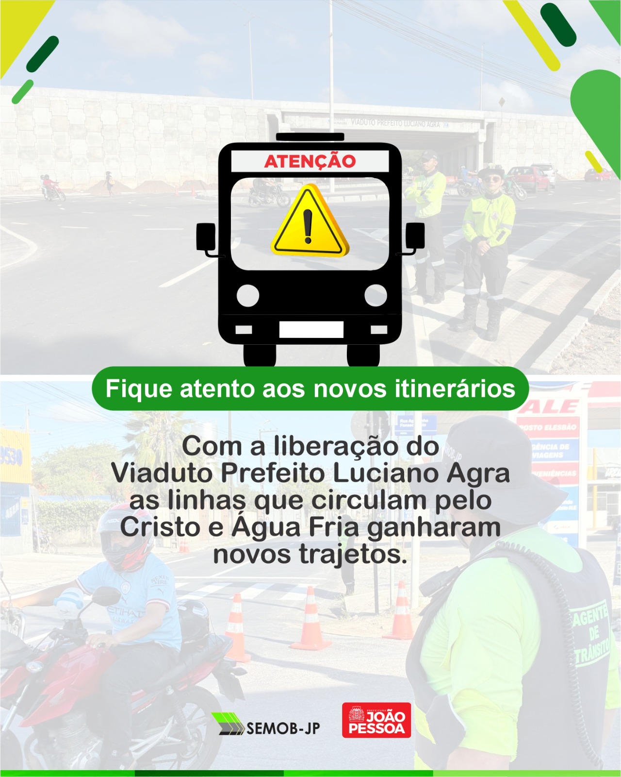 A abertura do Viaduto Prefeito Luciano Agra, em Água Fria, provocou mudanças nos percursos de diversas linhas de ônibus que circulam pelos bairros Cristo Redentor, Água Fria e adjacências, em João Pessoa. A Superintendência de Mobilidade Urbana (Semob-JP) orienta os usuários a conferirem os novos trajetos antes de sair de casa.