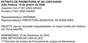 Segundo o extrato publicado no Diário Oficial do MPPB, a abertura do procedimento se deu a partir de denúncia anônima, sem identificação do autor da reclamação. O documento menciona a necessidade de verificar a efetiva prestação de serviços conforme as escalas de trabalho acordadas entre os médicos e o poder público local, levantando dúvidas sobre eventuais jornadas reduzidas ou ausências injustificadas.
