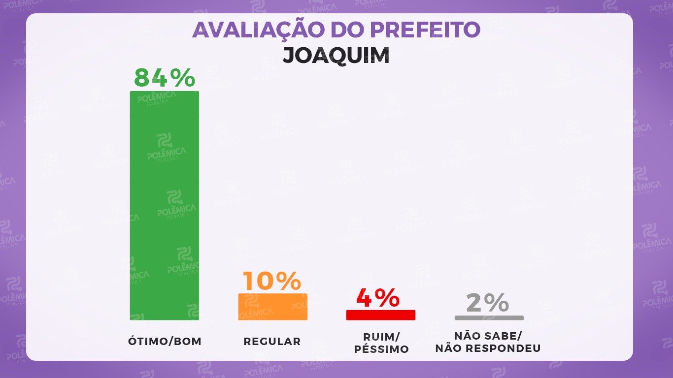 Conforme a pesquisa, 84% dos entrevistados consideram a gestão “ótima” ou “boa”, enquanto 10% a classificam como “regular”. Apenas 4% julgam o governo “ruim” ou “péssimo”, e 2% não souberam ou preferiram não responder.