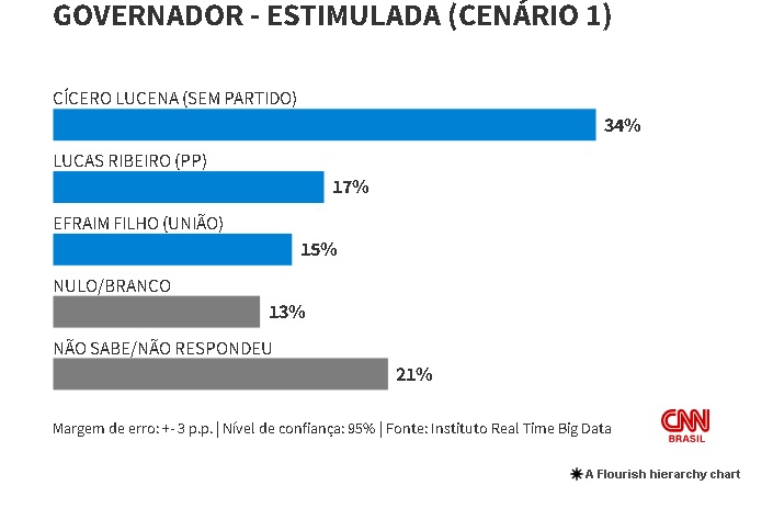 No primeiro quadro de concorrentes, composto por três nomes, Lucena lidera com 34% das intenções de voto. O vice-governador Lucas Ribeiro (PP) registra 17%, enquanto o senador Efraim Filho (União) soma 15%. Os eleitores que declaram voto em branco ou nulo representam 13%, e 21% não souberam ou preferiram não responder.