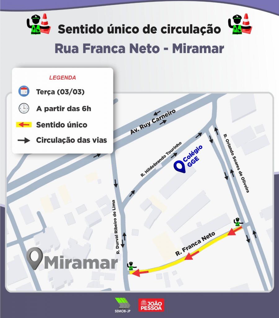 Em Miramar, a Rua Franca Neto deixará de operar em mão dupla e será convertida para sentido único no sentido da Rua Dr. Agrícola Montenegro. A alteração se justifica pelo intenso fluxo de veículos na via, gerado pela presença de um colégio e por diversos estabelecimentos comerciais e de serviços, que provocam maior demanda especialmente nos horários de pico.